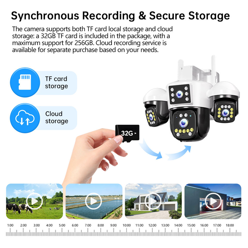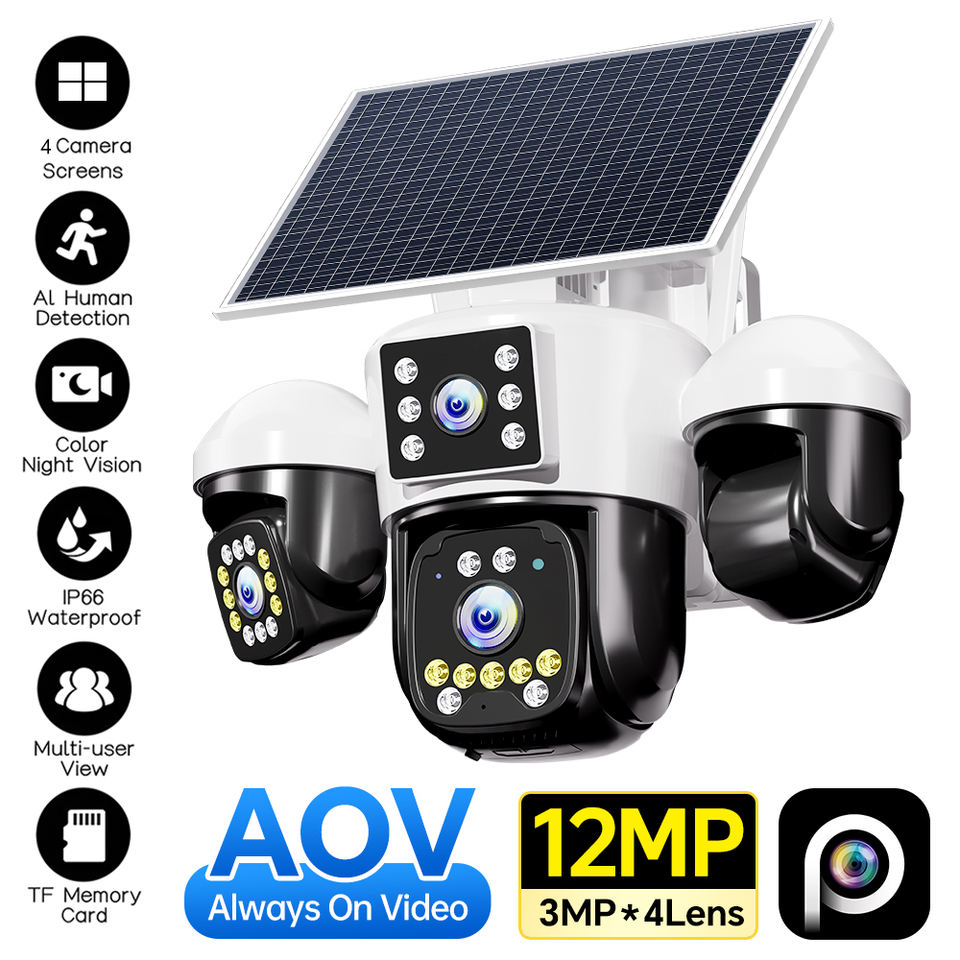 Caméra CCTV extérieure solaire 12MP AOV 4 objectifs 4 vues en direct 360° ° Caméra de sécurité PTZ Détection humaine Vision nocturne couleur IP66