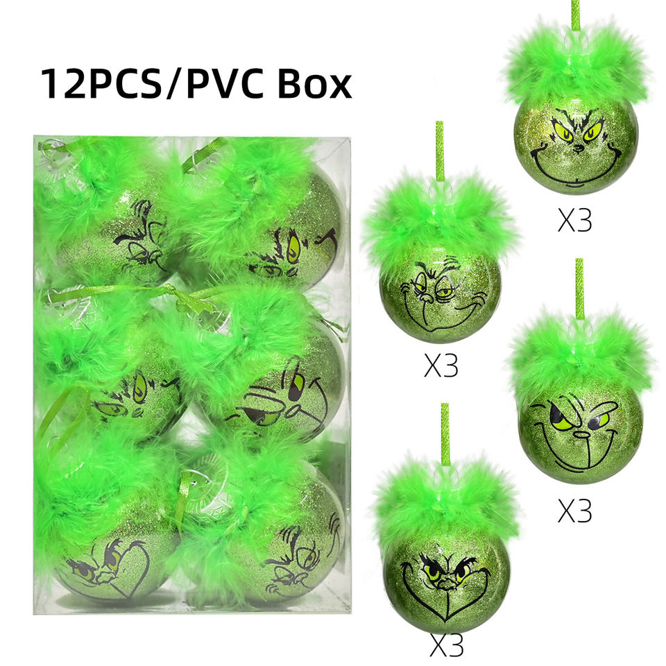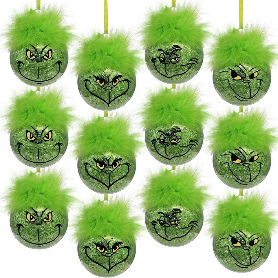Lot de 12 Boules de Noël Monstre Elfe Vert du Grinch à Poils duveteux, Guirlande de Boules de Noël Voleur Suspendues pour Décoration de Maison pour Enfants