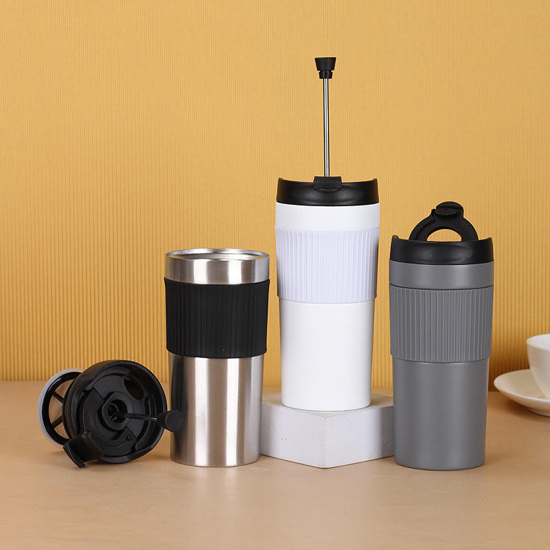 Mug de voyage isotherme en acier inoxydable minimaliste et écologique de 12 oz avec presse française, personnalisable avec logo, idéal pour la rentrée scolaire