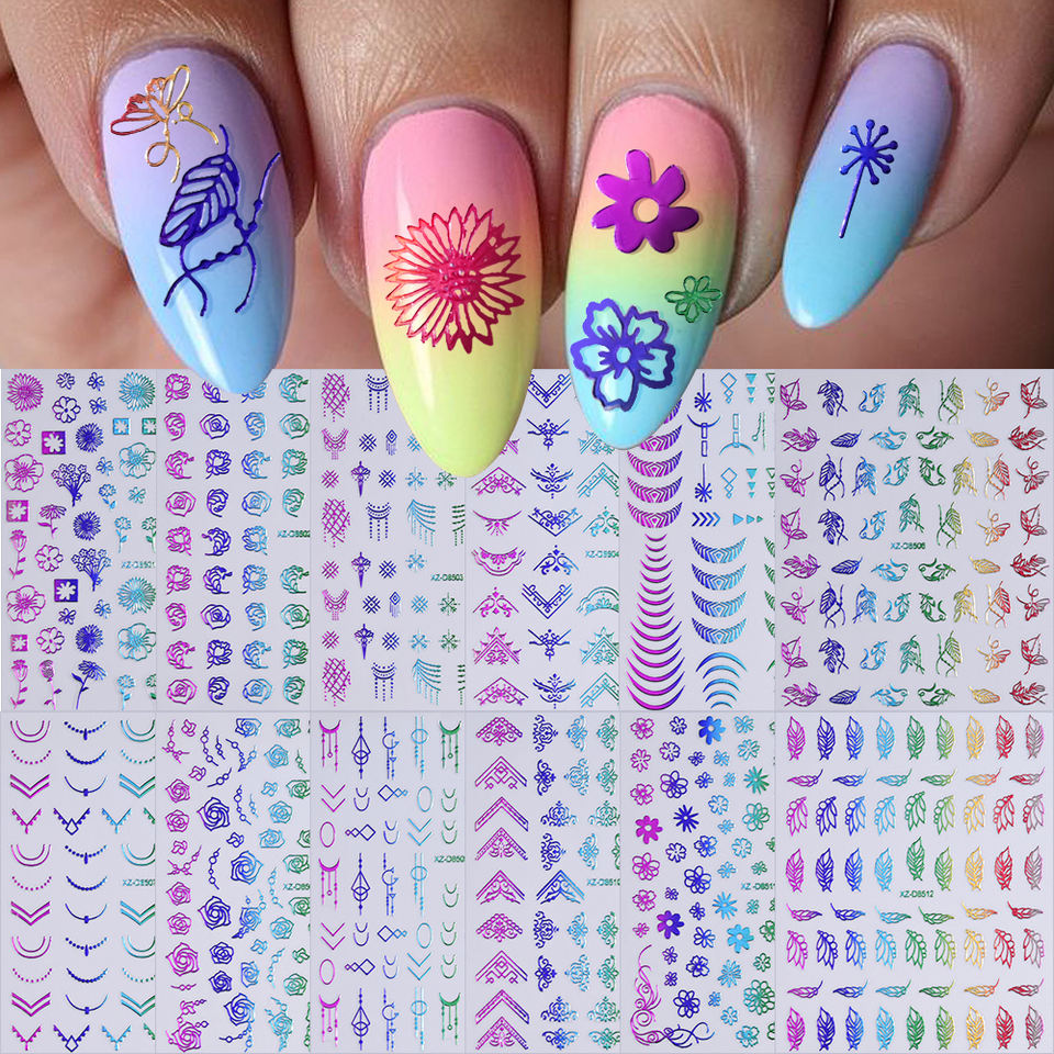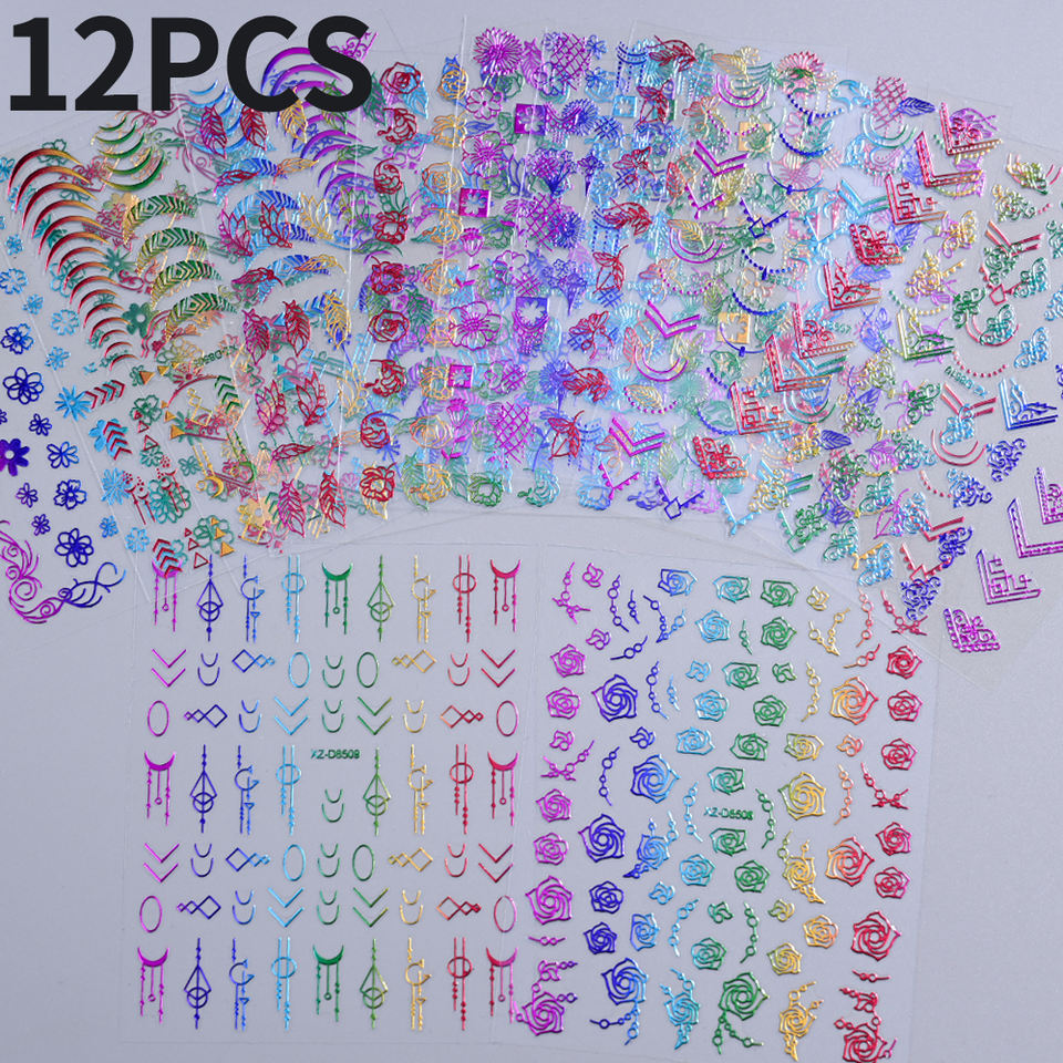 12 pièces coloré français ligne fleur Nail Art autocollants 3D feuilles/fleurs/motifs géométriques ongles décalcomanies auto-adhésif manucure