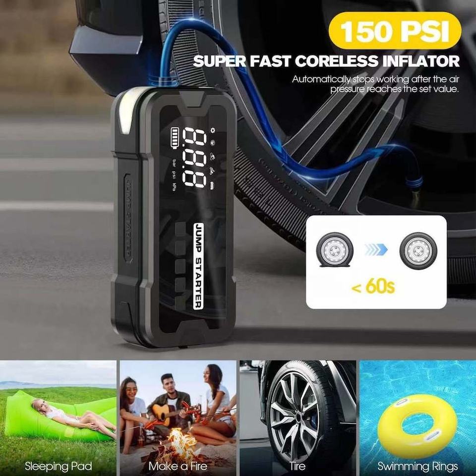 Démarreur Autonome Portable 12V 4-en-1 avec Compresseur d'Air, Banque d'Alimentation et Pompe à Air pour Voiture