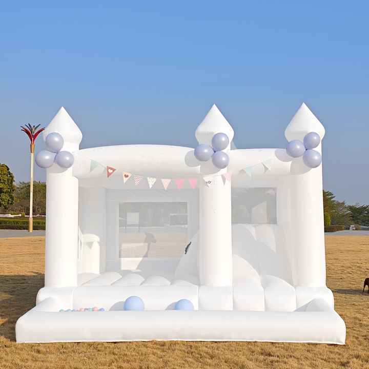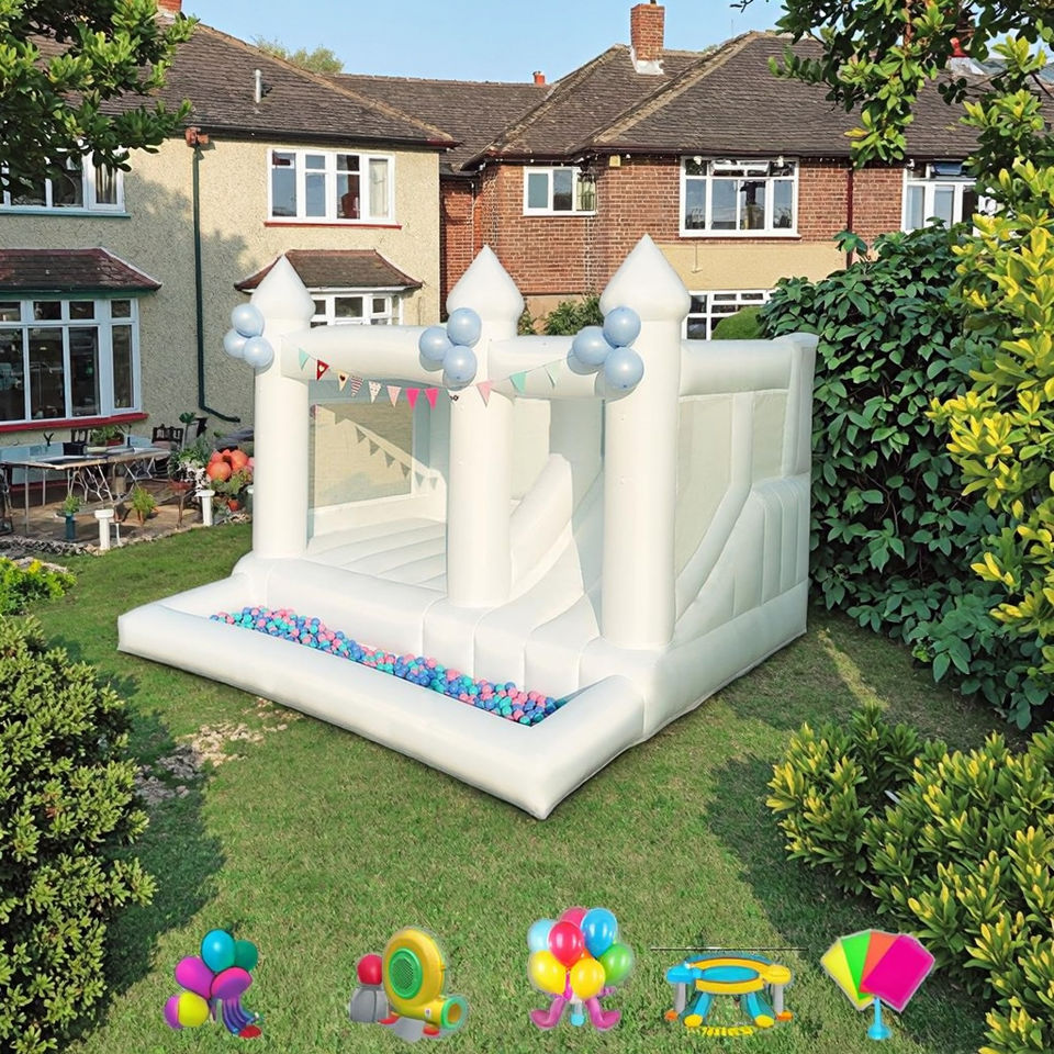 Château gonflable blanc de 13 x 13 pieds avec fosse et toboggan, pour les fêtes d'anniversaire en intérieur et en extérieur, décorations de mariage, location pour entreprises