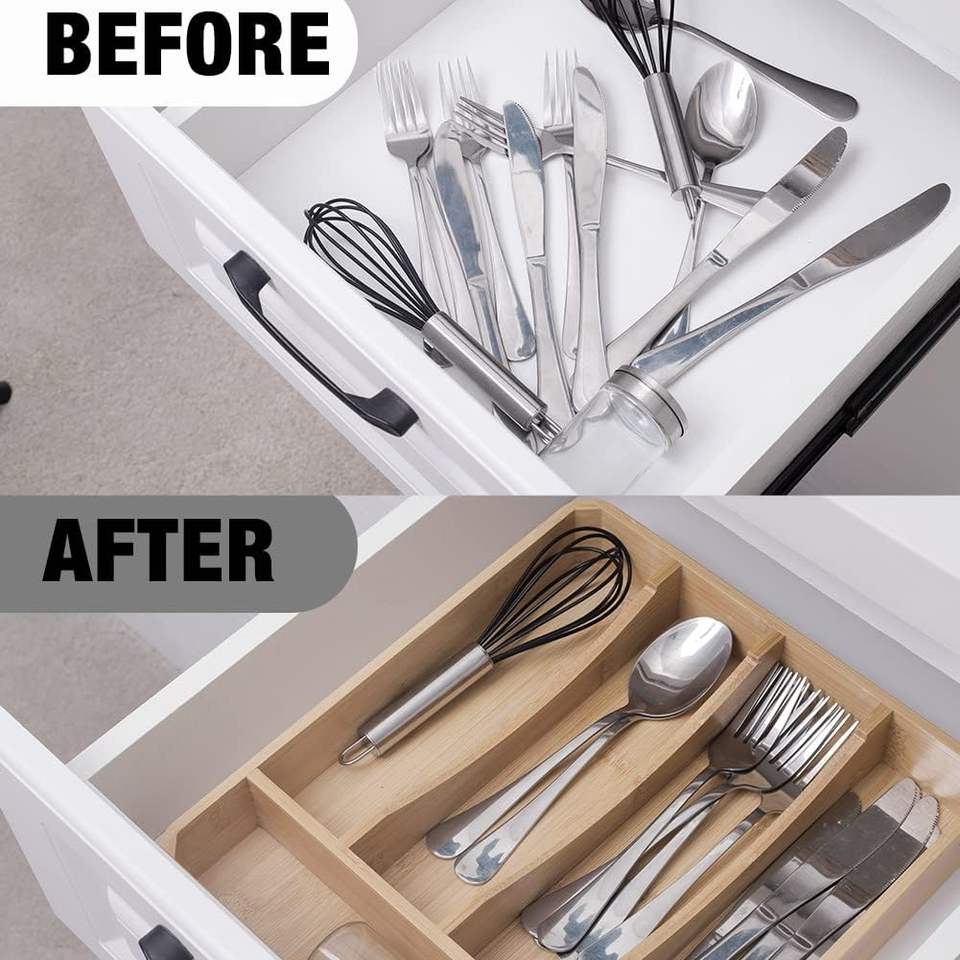 Organisateur de tiroir en bambou de 13 pouces avec couvercle, plateau à 5 compartiments pour couverts et ustensiles de cuisine