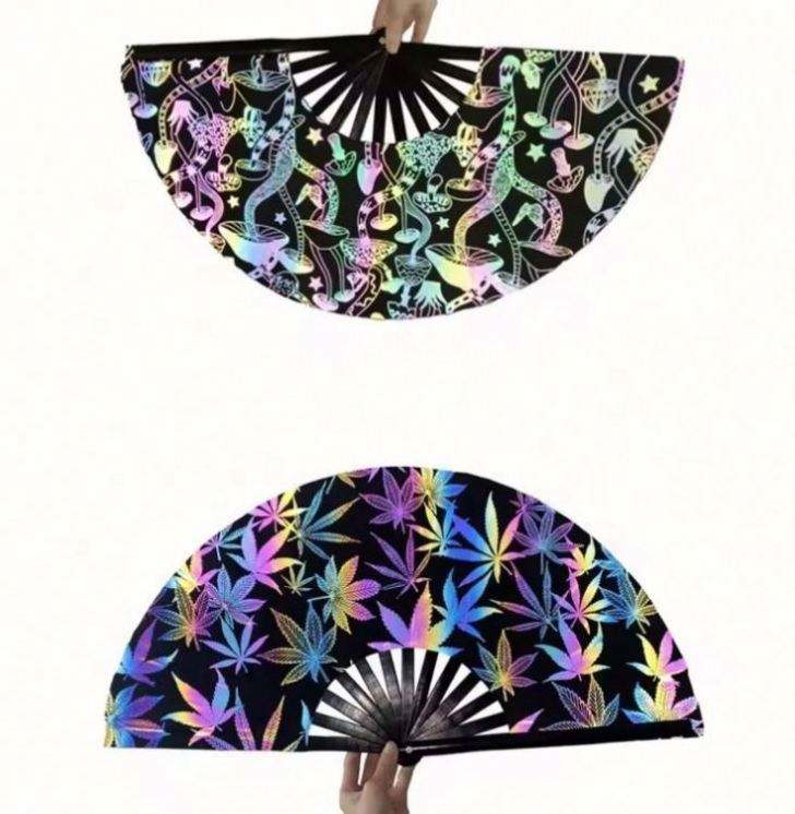 Éventail pliant en bambou noir de 33 cm avec tissu réfléchissant, sculpté à la main, cadeau d'affaires promotionnel pour l'Europe