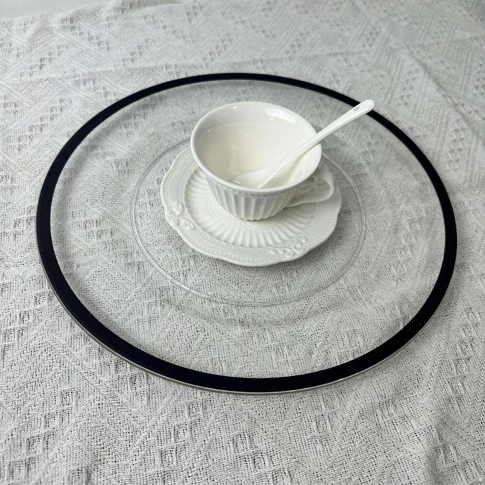 Assiettes de présentation en acrylique transparentes de 13 pouces, écologiques, à bord noir, avec bord doré, en plastique transparent, en vrac, bon marché, pour les occasions de mariage