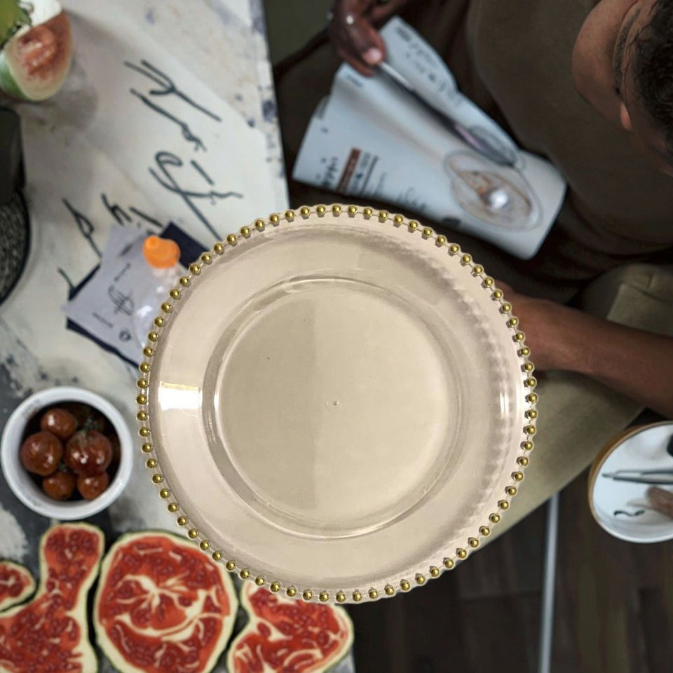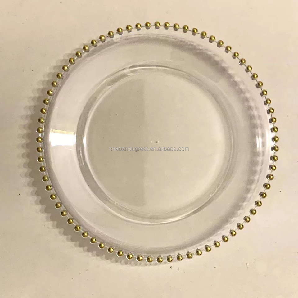 Assiettes de présentation rondes en plastique transparent avec bordure dorée de 13 pouces, assiettes de présentation pour dîner, assiettes de présentation dorées à perles