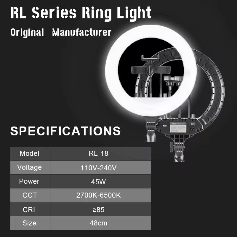 Anneau lumineux TikTok RL18 de 14/18/21 pouces pour le maquillage professionnel, éclairage LED avec trépied, contrôle par application, couleur réglable