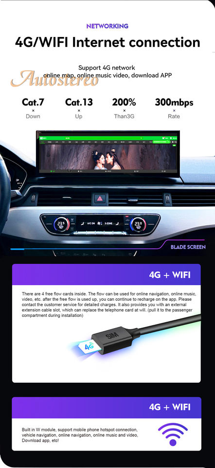 Usb, Carte SD, Carte TF, Carte Sim 3G/4G, Construit en WiFi