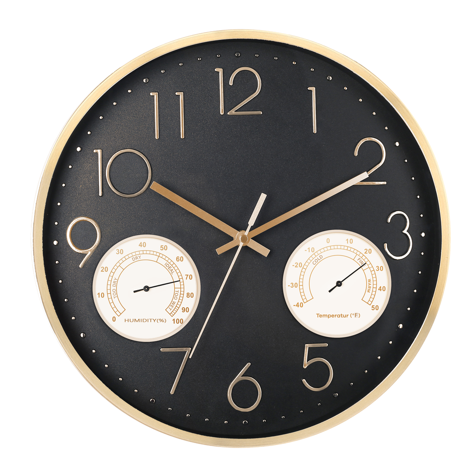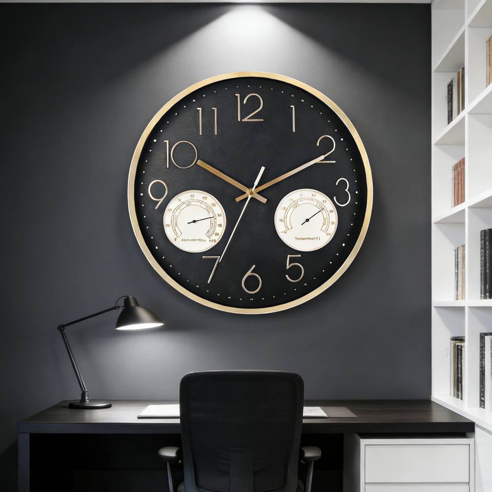 Horloge murale analogique à quartz silencieuse en métal noir et or de 14 pouces avec thermomètre et hygromètre, fonctionne sur piles