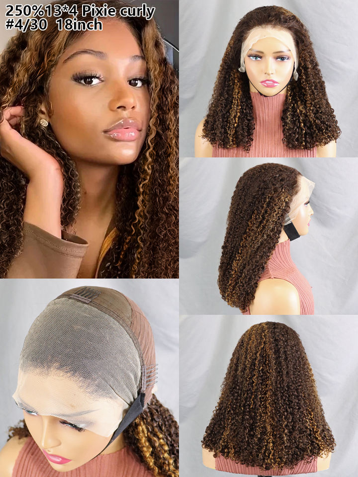 14 pouces pour Pixie Curly 13x4 250% densité 4/30 # 100% perruques de cheveux humains