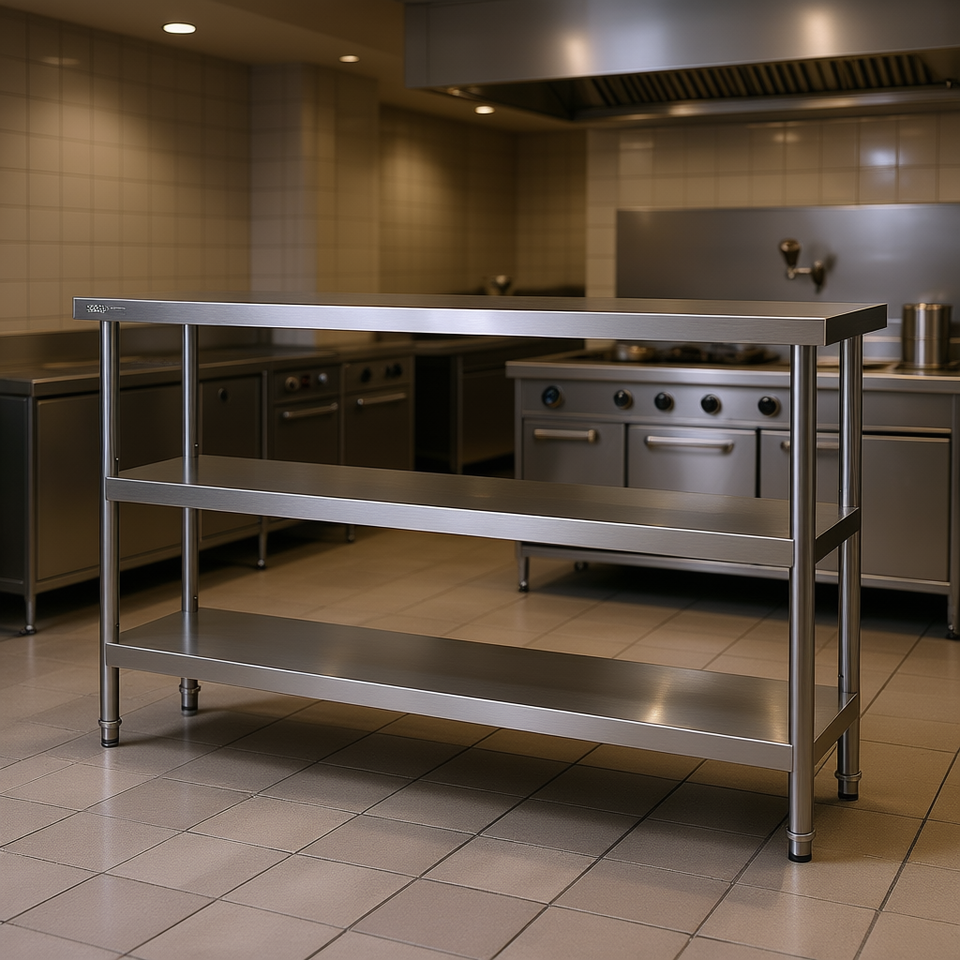 Table de préparation alimentaire en acier inoxydable Vevor, 14 x 60 x 34 pouces, trois niveaux, robuste, pour cuisine commerciale, finition polie, capacité de charge de 1000 kg