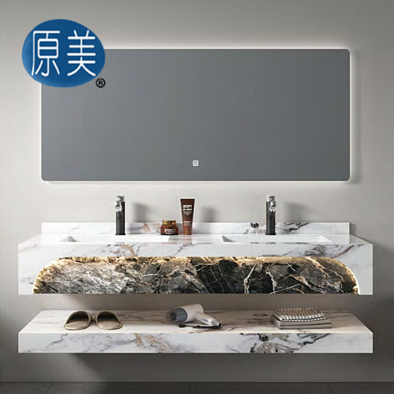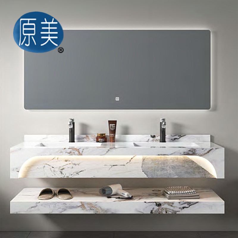 140cm double éviers rétroéclairage LED Grain de bois bassin en pierre frittée armoire en ardoise de roche surface solide vanité flottante marbre vanité