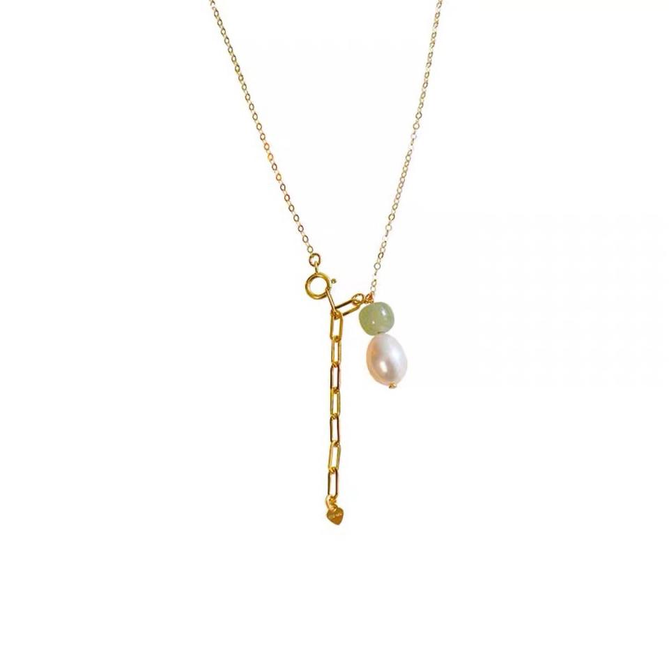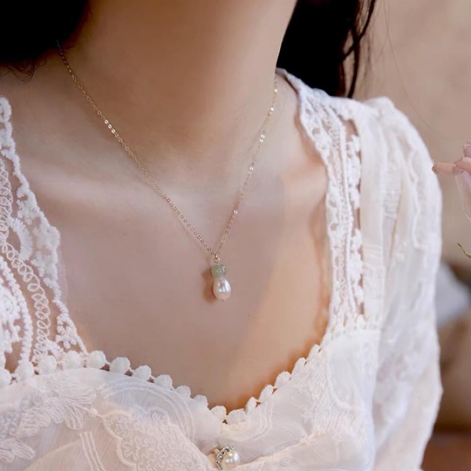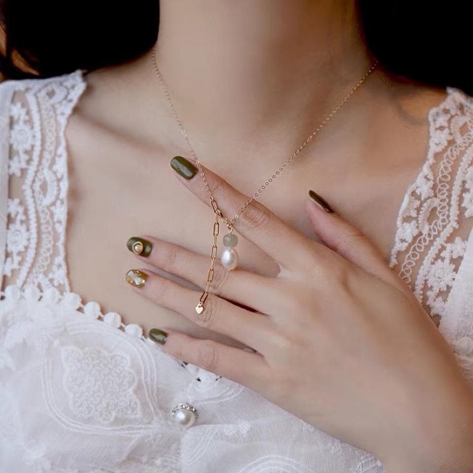 Chaîne de clavicule en or 14 carats avec jade bleu naturel Perle d'eau douce de Hotan Design simple Collier Chaînes fines pour femmes