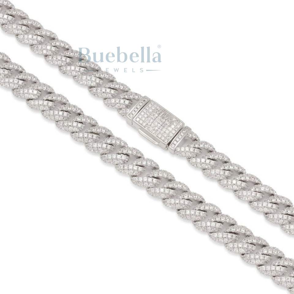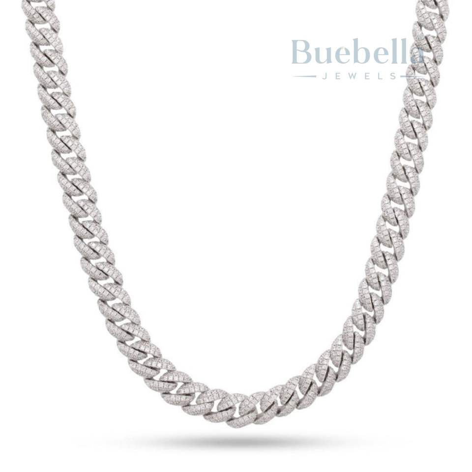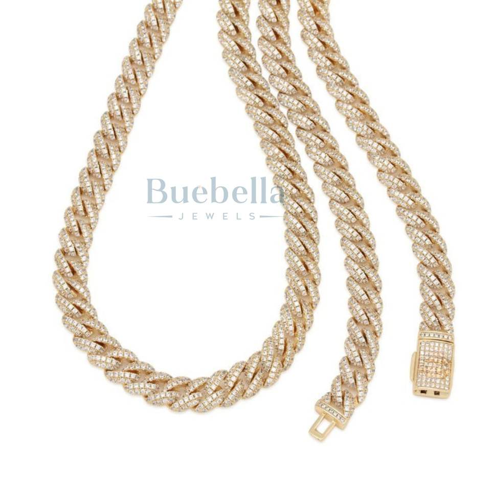 BUEBELLA JEWELS 14K Gold Plated 925 Sterling Silver 10mm Iced Out Hip Hop Miami Cuban Link Chain Women's Moissanite Jewelry