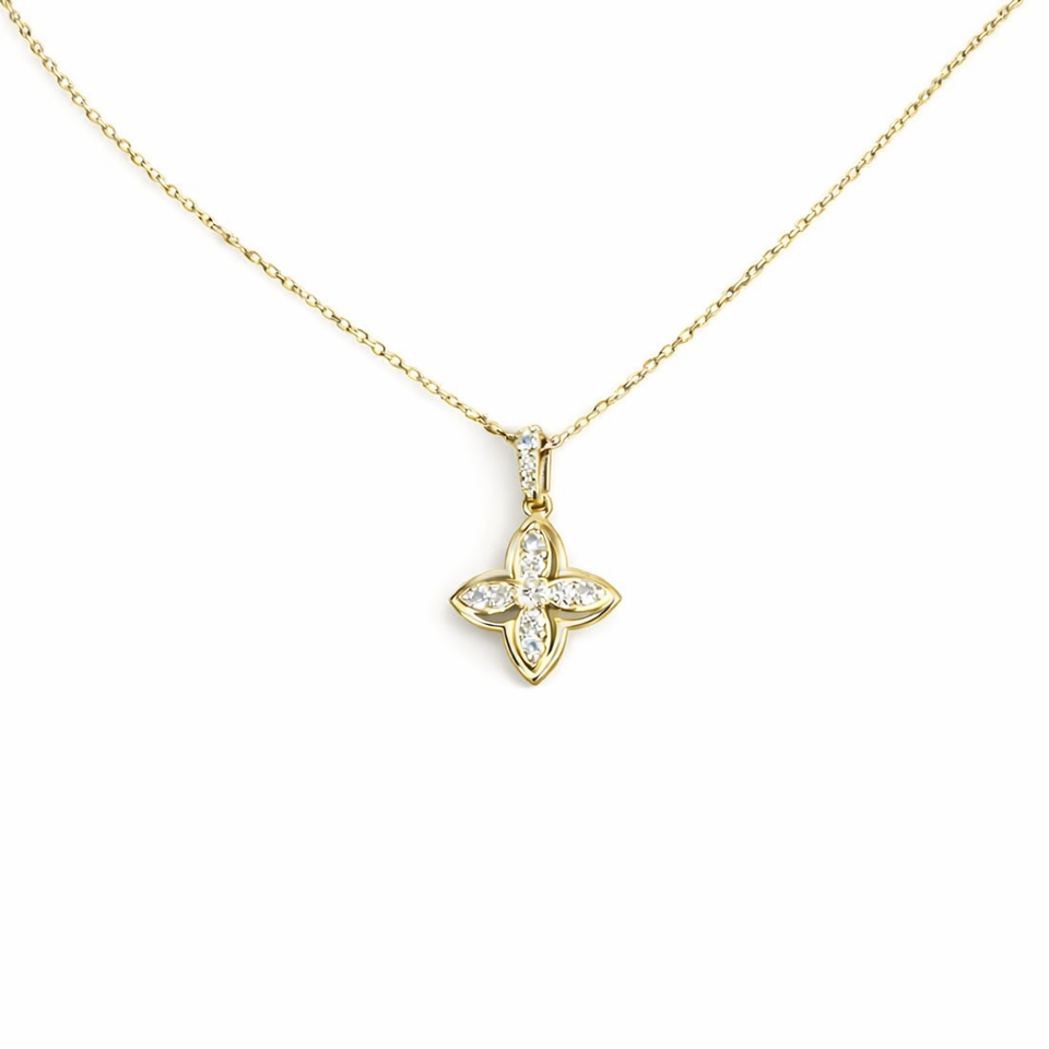 14K Pure Solid Gold or Silver Sparkling Elegant Diamond Four Leaf Clover Pendant Necklace with Four Petal for Everyday Wear Gift
