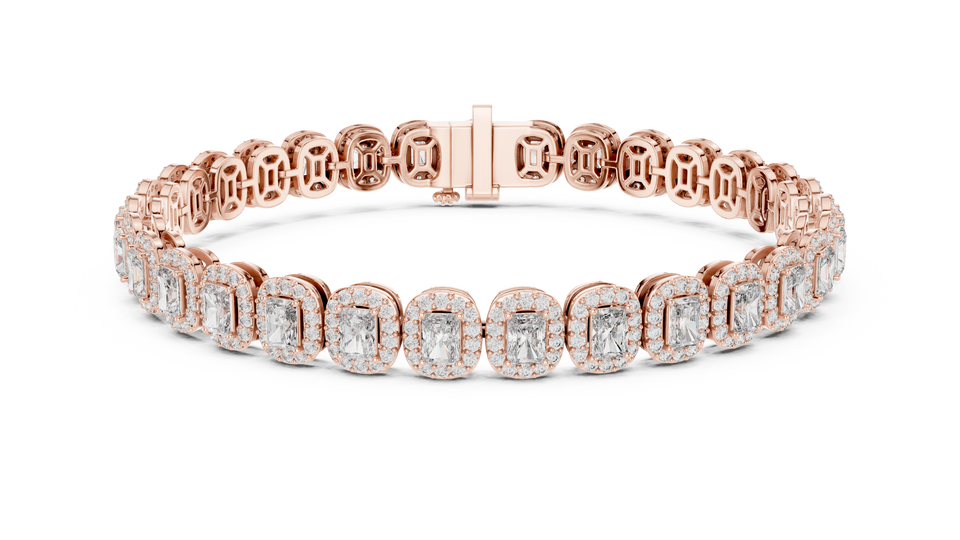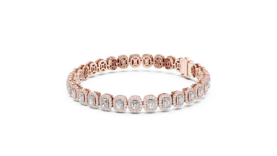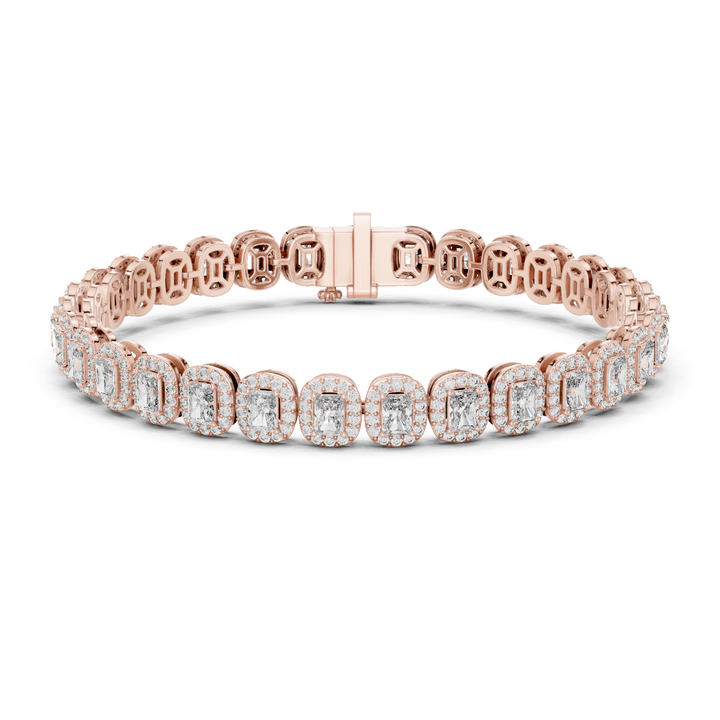 Bracelet tennis en or rose 14 carats plaqué or avec diamants de laboratoire et halo d'émeraudes, design de luxe à taille émeraude pour femme