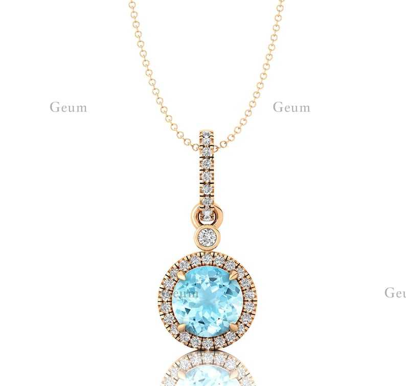 Collier pendentif solitaire en or rose massif 14 carats avec pierre précieuse naturelle aigue-marine et halo de diamants véritables, cadeau de mariage pour elle