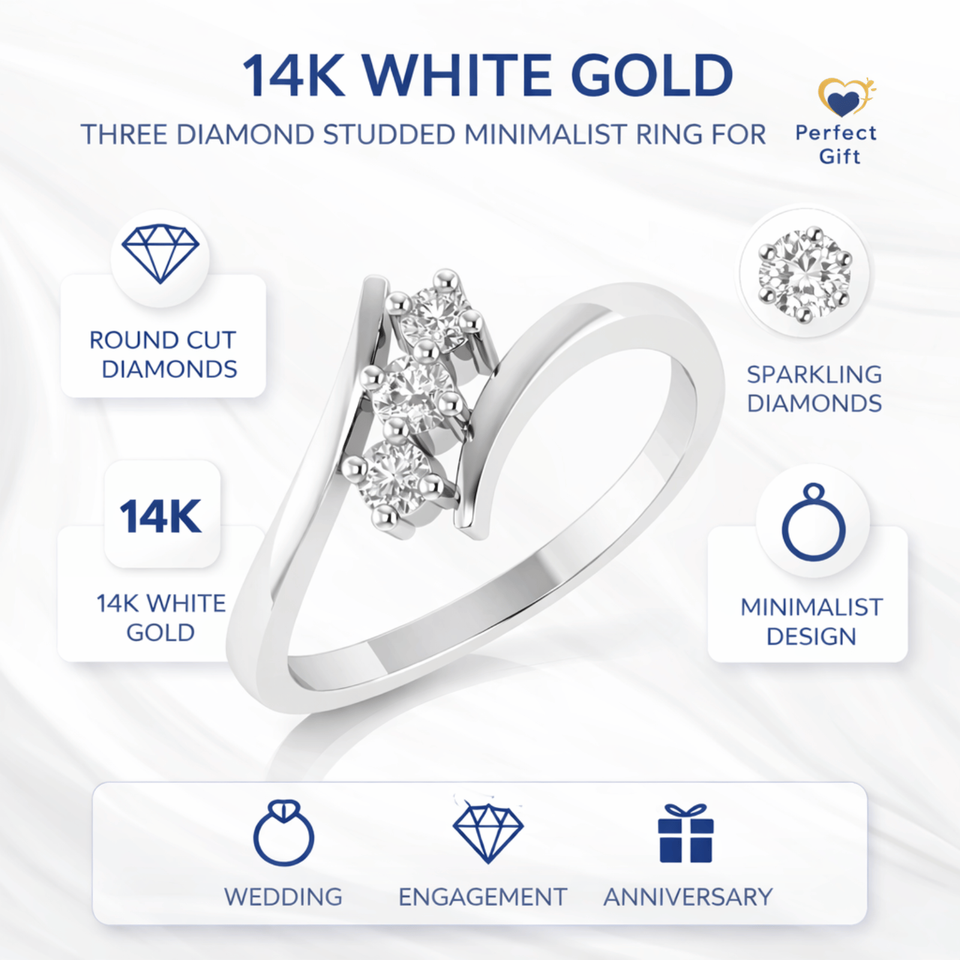 Bague en or blanc 14 carats sertie de trois diamants pour femmes, diamant taille ronde, bijoux minimalistes pour mariage, fiançailles, anniversaire, cadeau