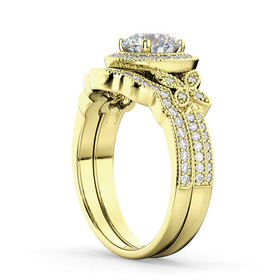 14K Yellow Gold Fine Jewelry Set Butterfly Diamond Engagement Ring & Wedding Band (0.58ct)