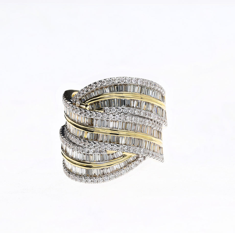 Bague croisée multi-rangs en or jaune 14K Design exquis avec baguette naturelle et diamants ronds dans les réglages du canal à broches