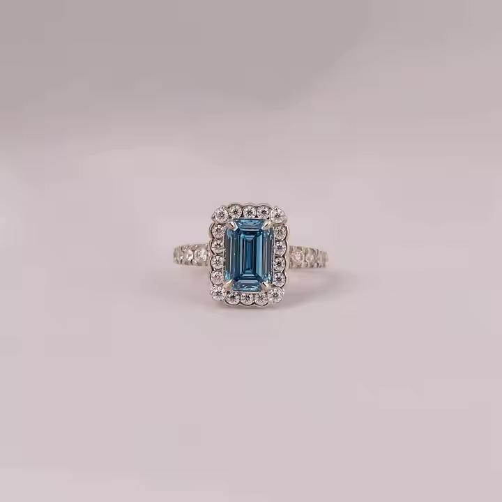 Bague de fiançailles solitaire en or massif 14KT Diamant de laboratoire taillé en émeraude bleue certifié IGI