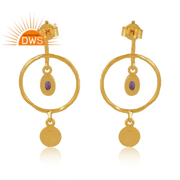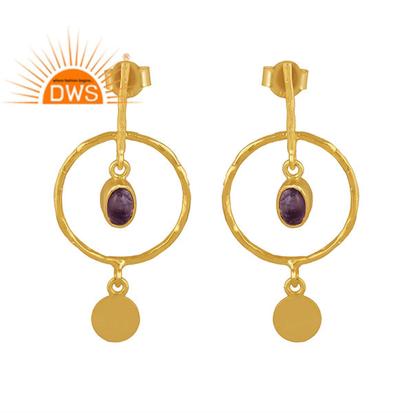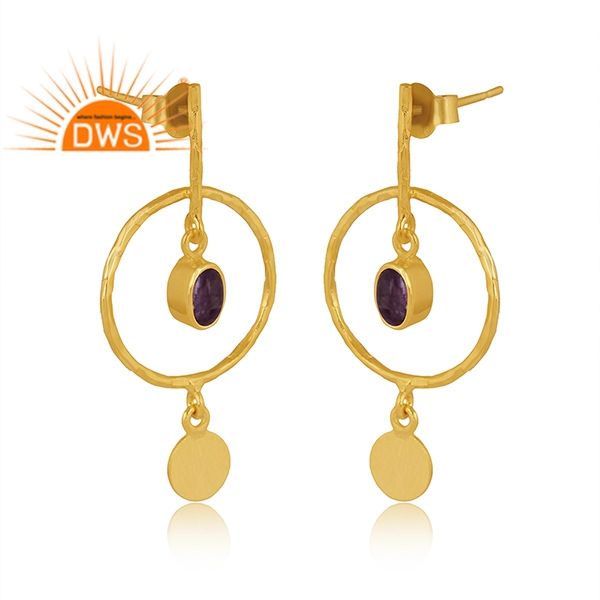 Boucles d'oreilles pendantes en argent sterling plaqué or 14 carats avec pierre précieuse améthyste naturelle taillée - Bijoux tendance pour fêtes et cadeaux