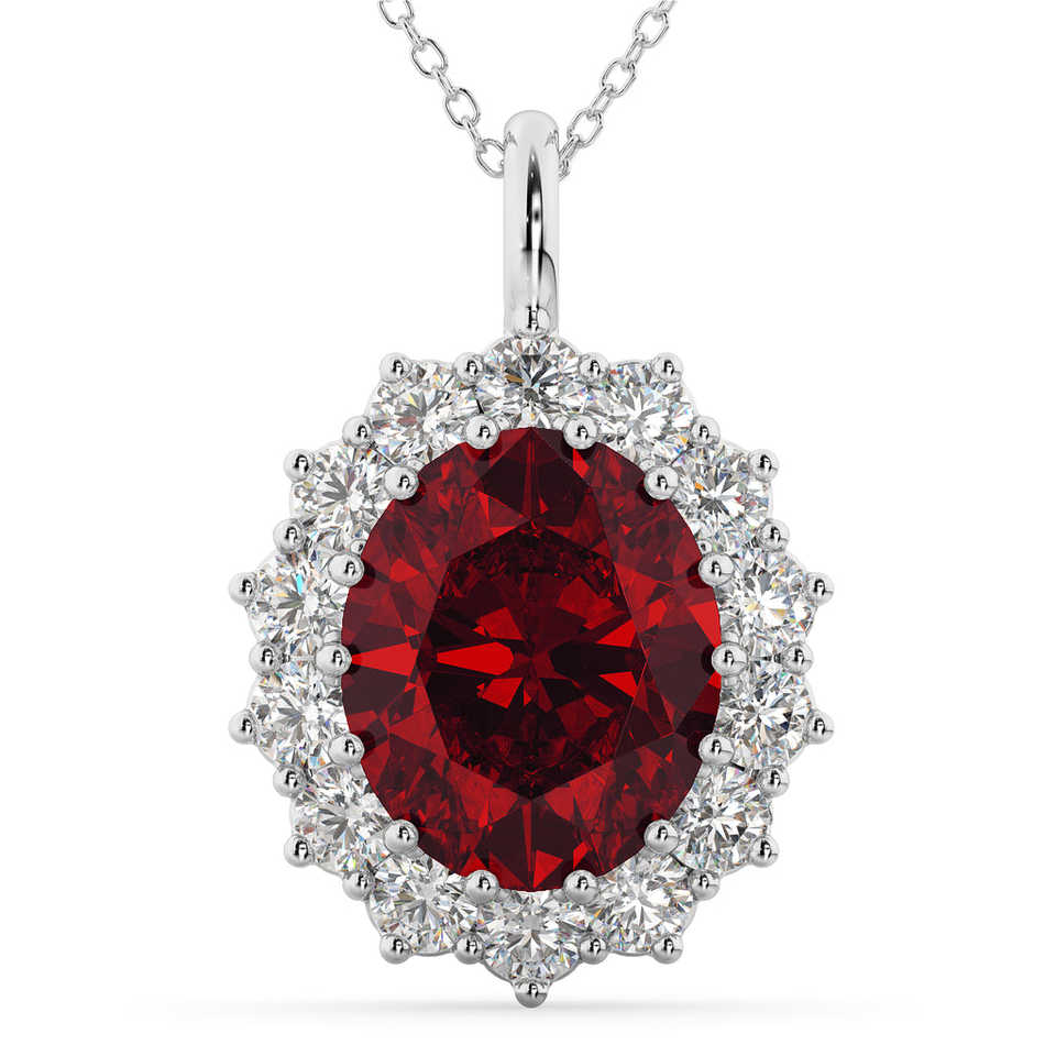 Collier pendentif halo en or blanc 14 carats avec rubis ovale et diamants, 6,40 carats de diamants