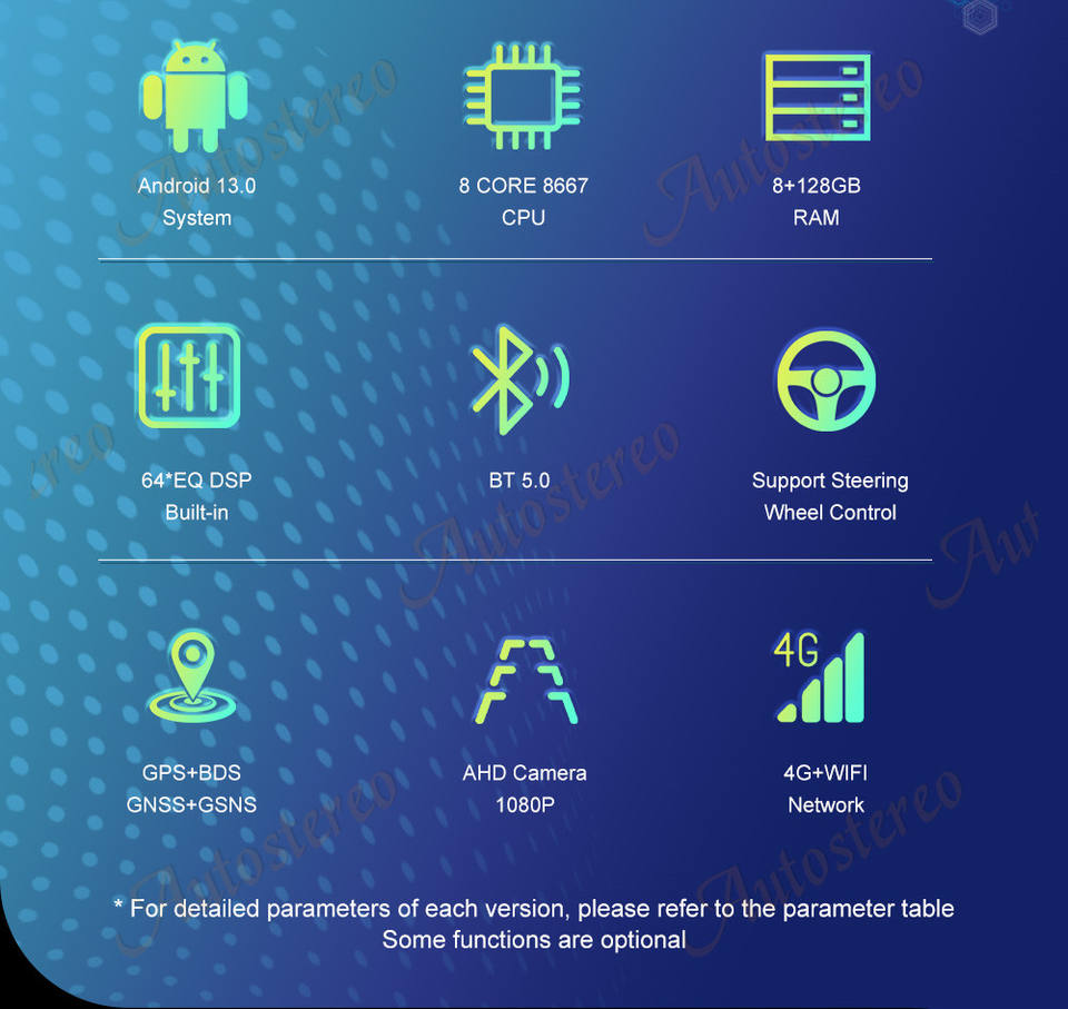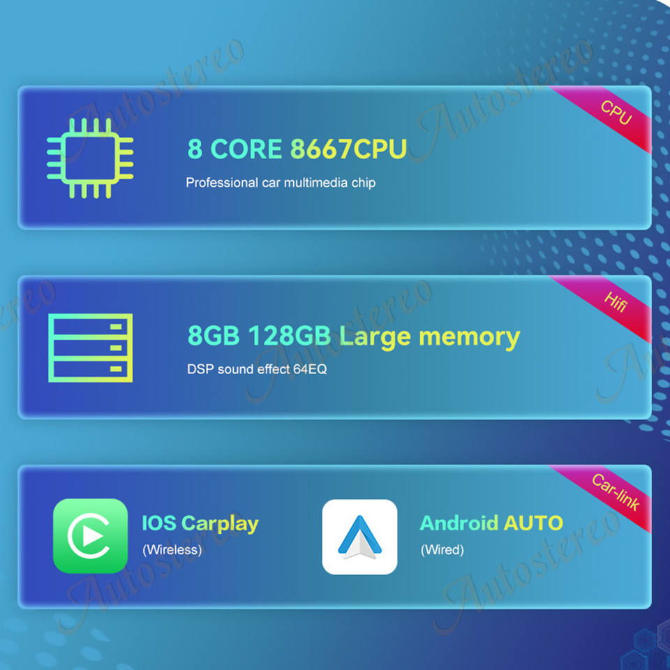 GPS, Stéréo, SANS MAINS, TPMS, Télécommande, Amplificateur, OBD2, DSP, CarPlay, DVB +, Lien de miroir, Android auto, Image dans l'image, Microphone intégré, Écran partagé, Gestionnaire de fichiers, Hi-Res Audio, Volant de voiture de Contrôle, Haut-parleur intégré