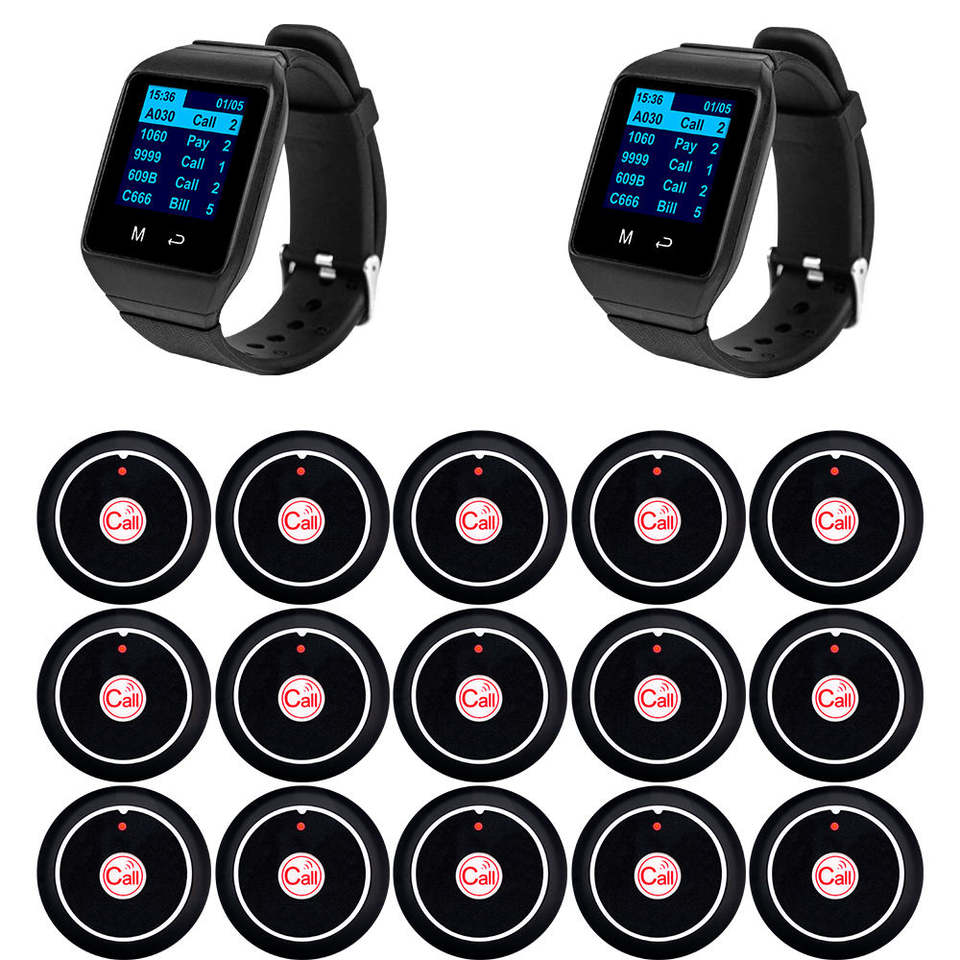 15 émetteurs de boutons d'appel + 2 montres vibrantes - Système d'appel sans fil pour restaurant / clinique