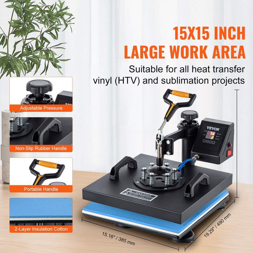Presse à chaud multifonctionnelle 5-en-1 avec double écran LED 15 x 15 pouces pour sublimation de t-shirts – Taille unique pour un pressage pratique