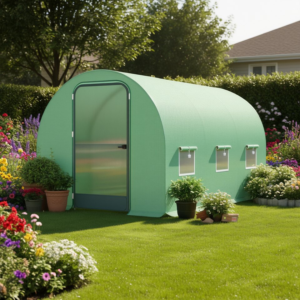 Serre de jardin extérieure 15x7x7 avec porte, fenêtres de ventilation, couleur verte, structure en PVC et aluminium