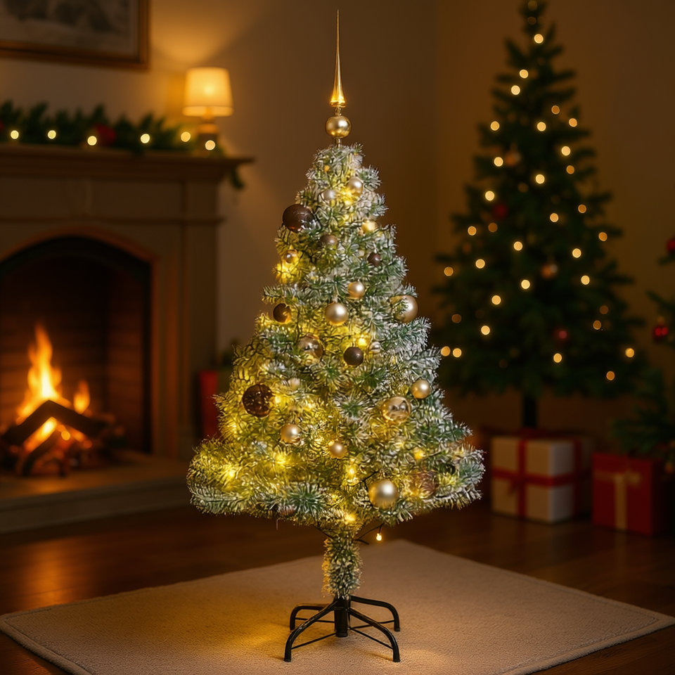 Sapin de Noël artificiel de 59,1 pouces avec flocons de neige, lumières LED et boules décoratives pour intérieur