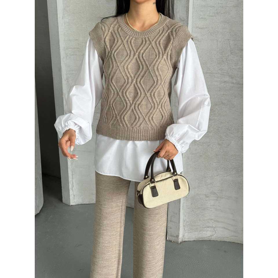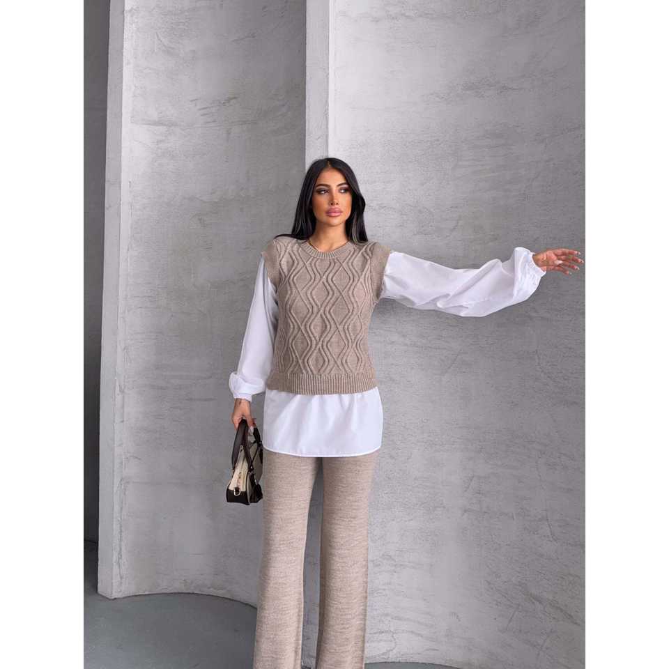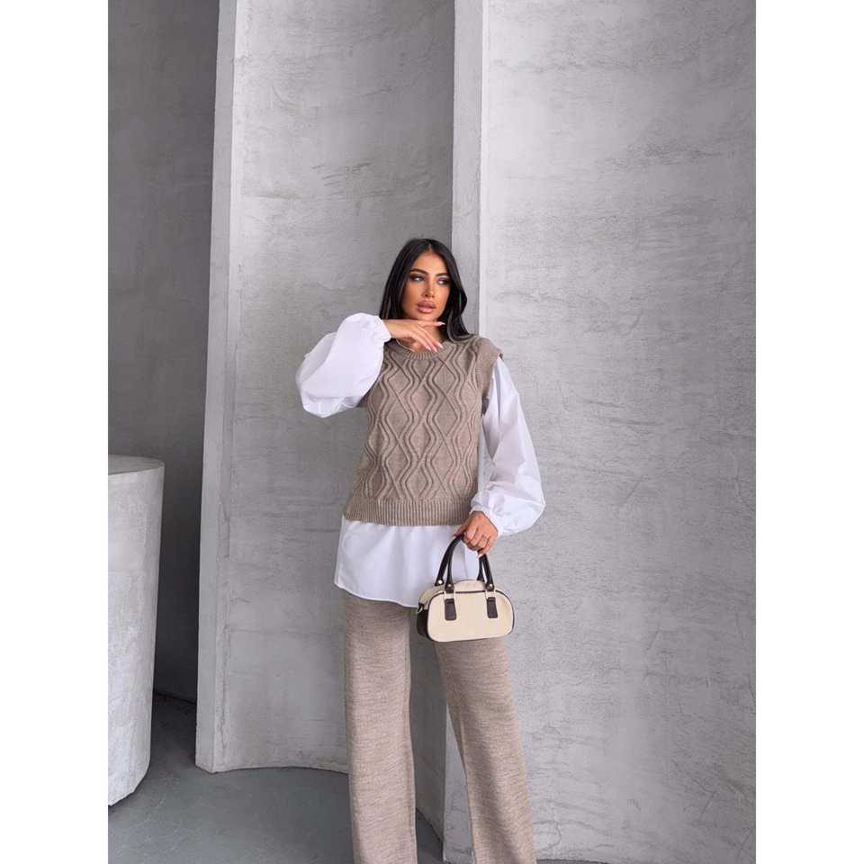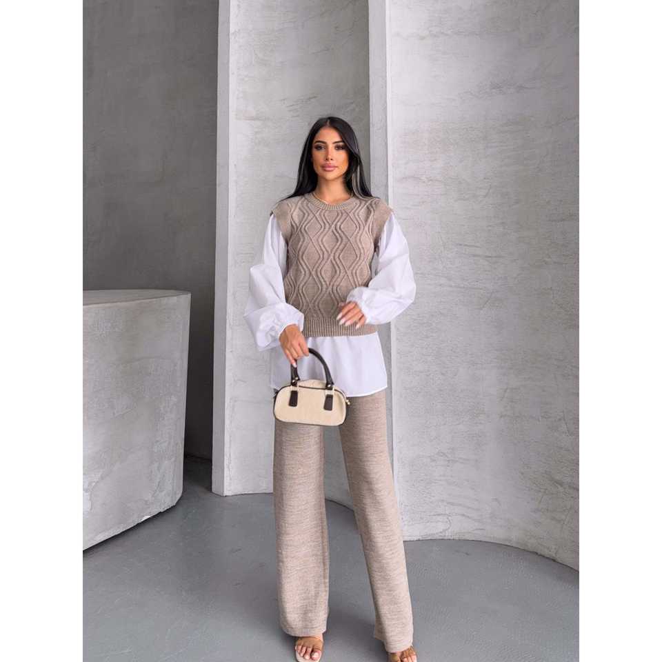 Ensemble de tricot 1561 avec détails brodés, coupe ample, tissu en laine, chemise à motif imprimé