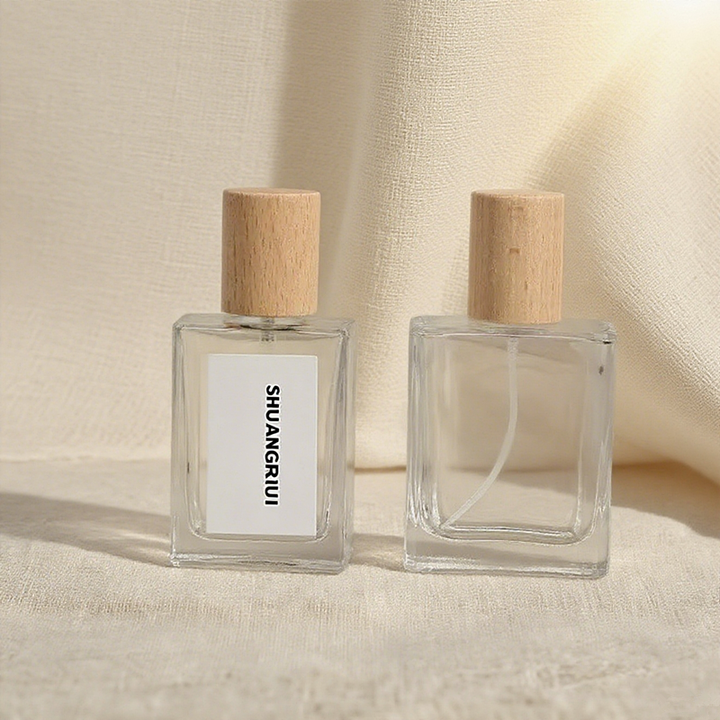 Flacons de parfum carrés en verre rechargeables de 15 ml, fond épais, avec bouchons en bois haut de gamme, avec pompe pulvérisatrice, emballés dans une boîte sérigraphiée