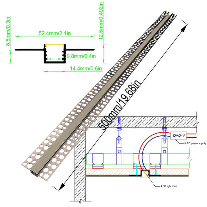 Profil de canal en aluminium de 15x9mm 0.5M LED pour bande lumineuse LED avec installation intégrée