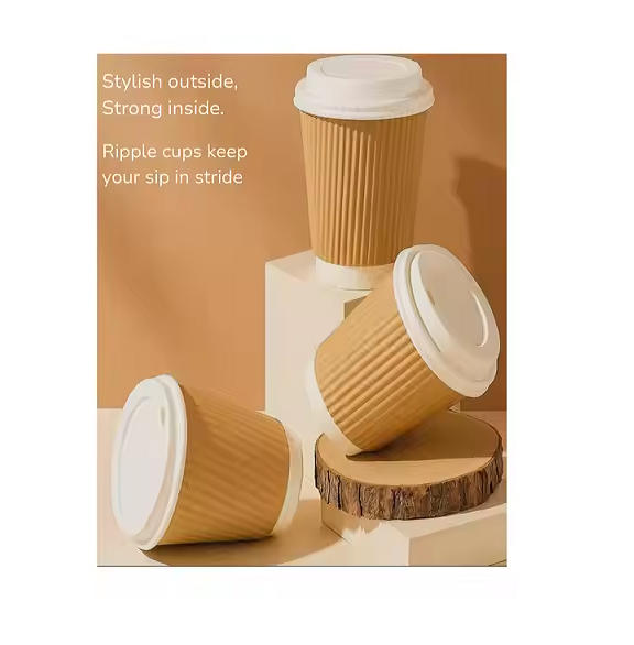 Tasses à café jetables biodégradables à paroi ondulée écologique de 16oz Tasses à boissons chaudes à double paroi avec couvercle pour fêtes pique-niques