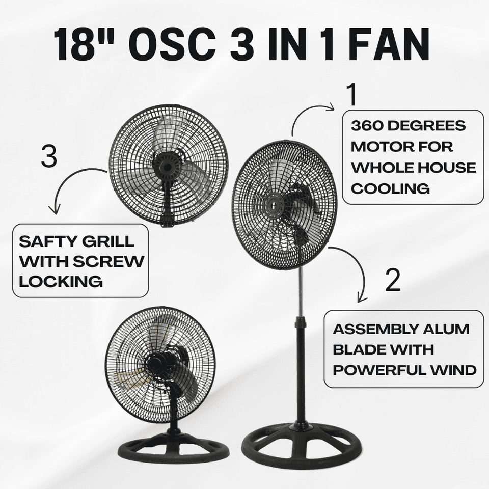 Ventilateur mécanique à énergie efficace 3 en 1 de 17,9 pouces avec grille en métal et 3 pales en aluminium, autoportant, pour usage extérieur et domestique