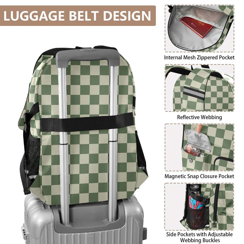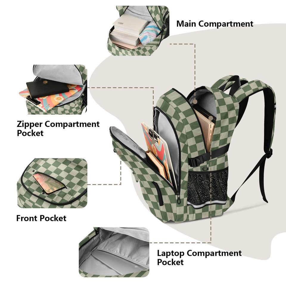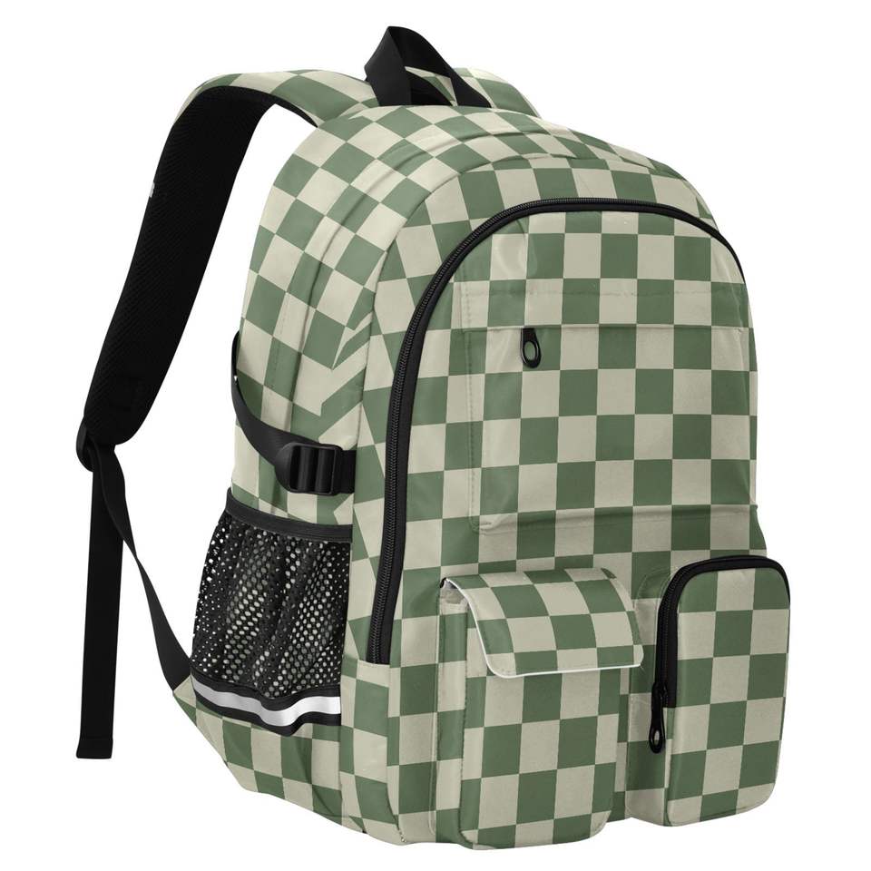 Sac à dos d'étudiant rembourré pour ordinateur portable de 17 pouces, motif à carreaux vert multi-poches, logo personnalisé, sac à dos de voyage pour l'école avec sangle de bagage
