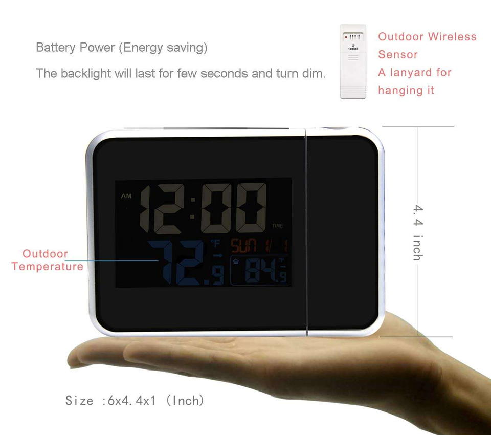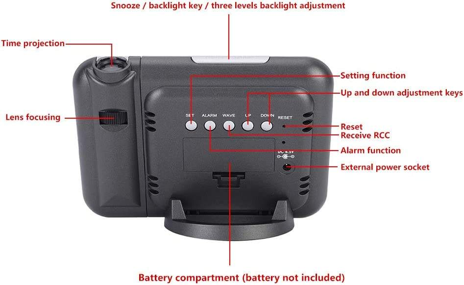 Horloge de bureau à projection radio-pilotée avec écran LCD numérique réglable à 180 degrés, avec calendrier et température intérieure/extérieure