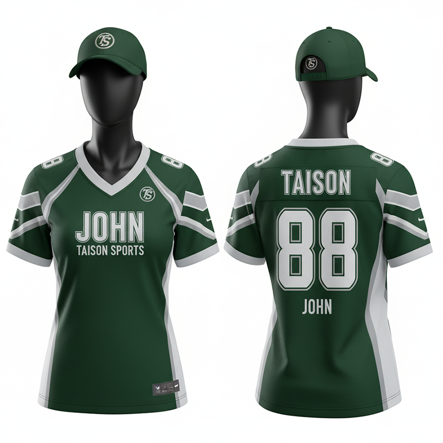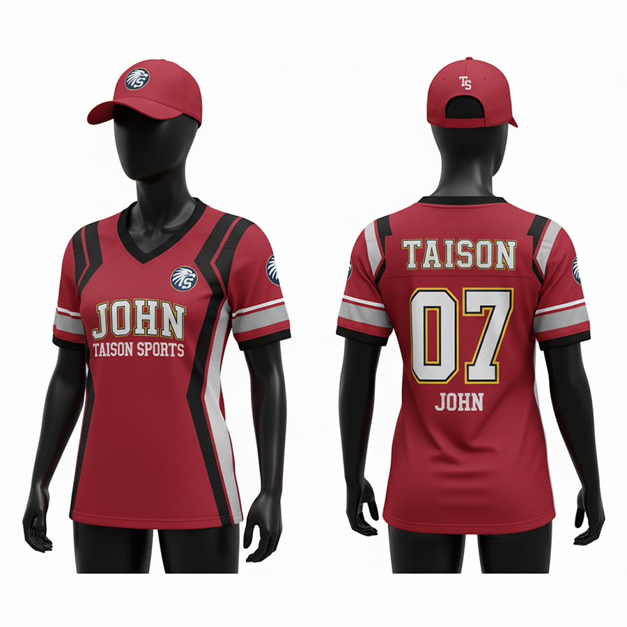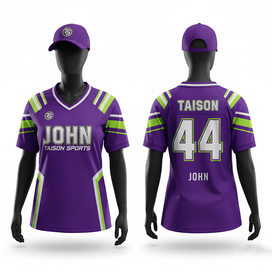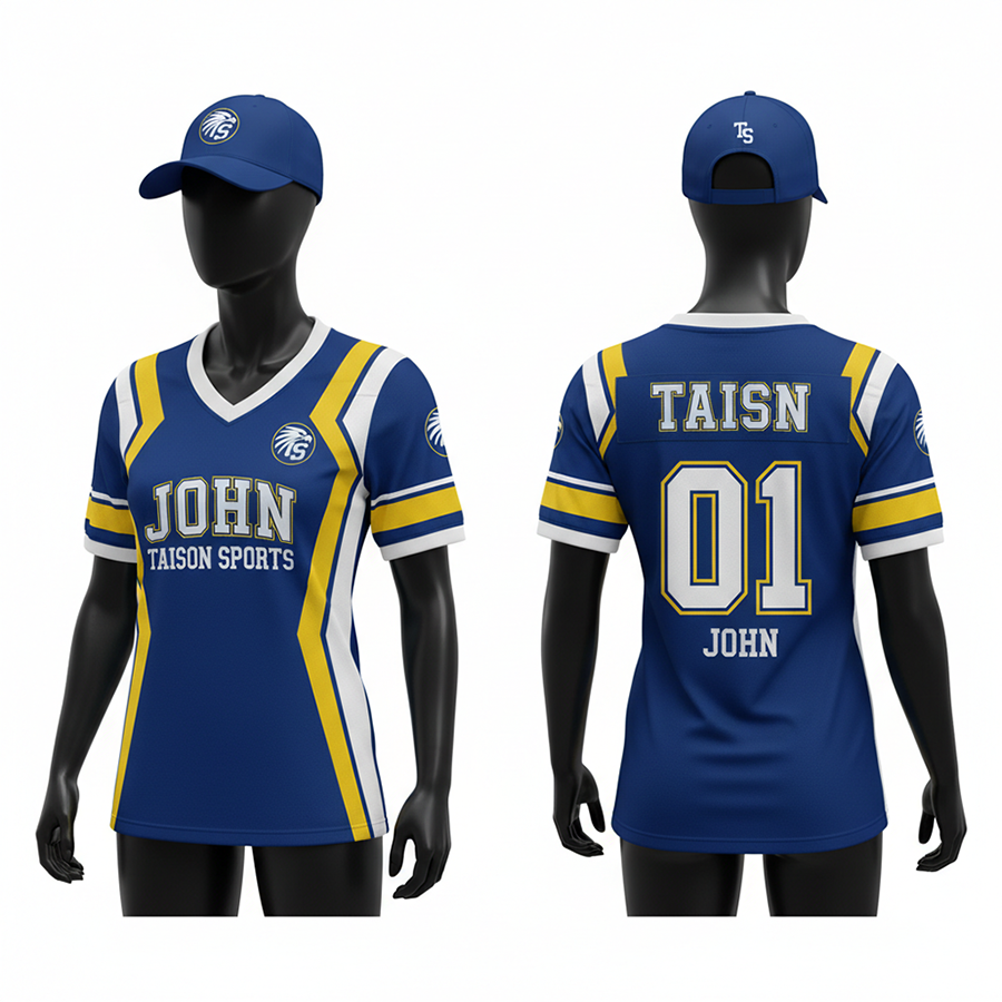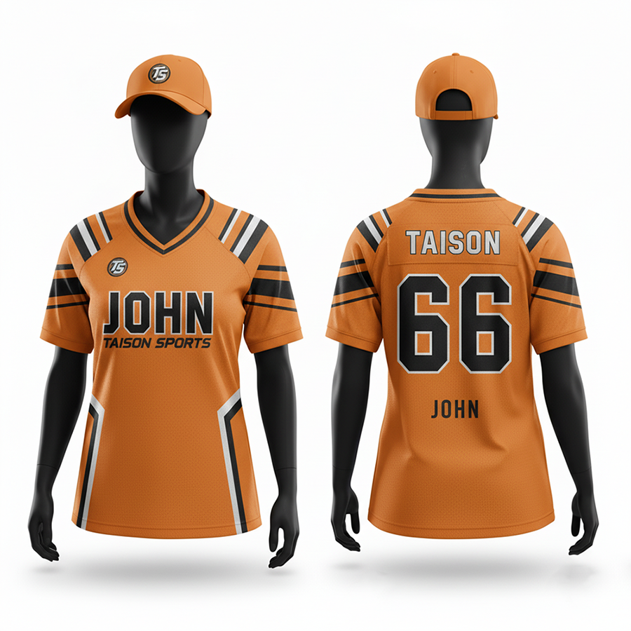 Maillot de football américain pour femmes en polyester premium 180 GSM avec panneaux rayés orange, noir et blanc, logo personnalisé par sublimation