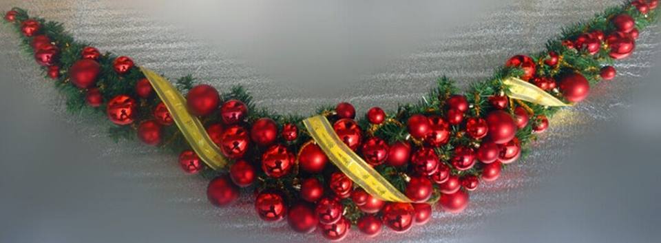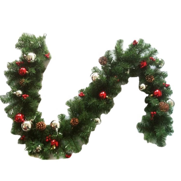 Branche de sapin de 180 cm avec boules rouges et ruban. Guirlande de noël décorative