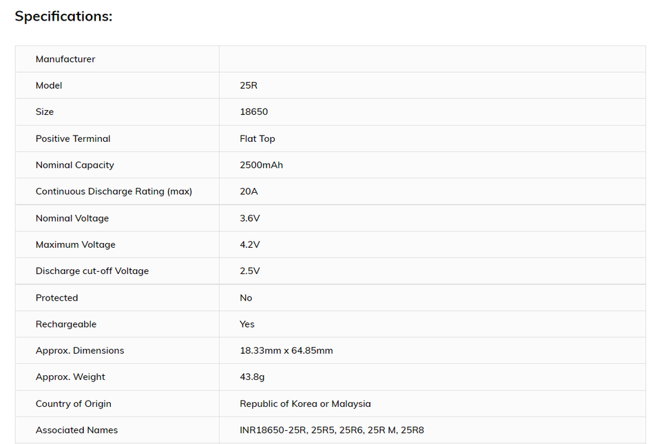 Batterie LiCoO2 Samsung 18650 INR18650 25R 2500mAh 3.7V 500 cycles