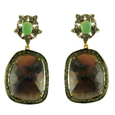 18K Gold Plated Gemstone Dangle Earrings Cute Green & Brown Stone Drop Earrings with Diamond & Pearl for Women for Parties