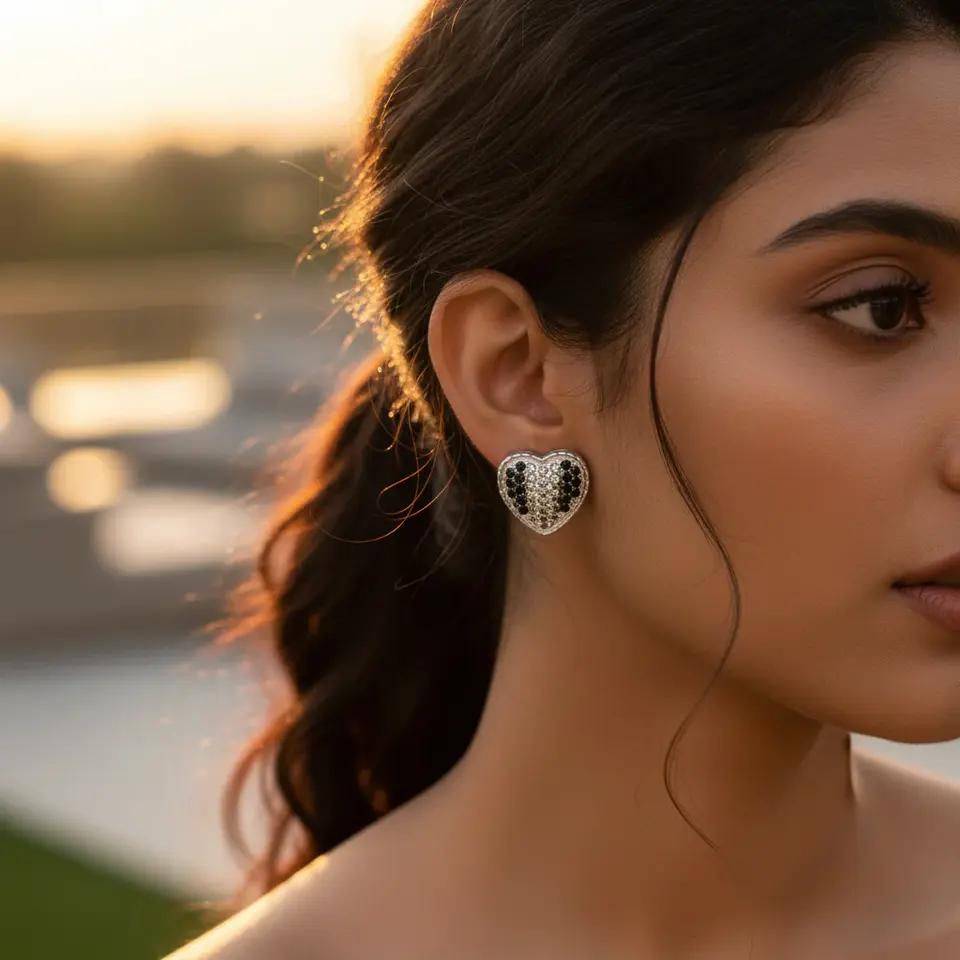 18K Gold Plated Trendy Silver Heart Stud Earrings with Black & White Pear Cut Gemstones for Engagement