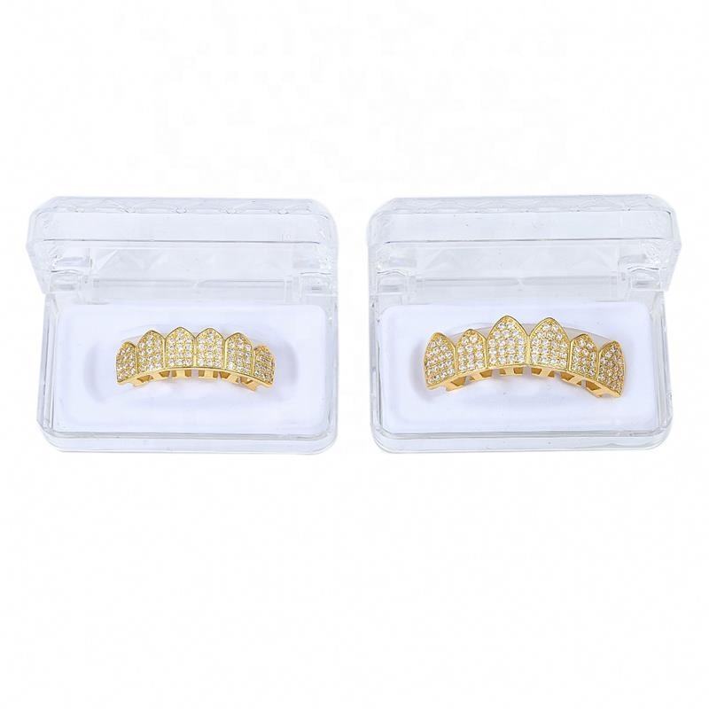 Laiton plaqué or véritable 18 carats avec prothèses hip hop bling zircon et crocs d'halloween dents grillz avec étui emballé individuellement