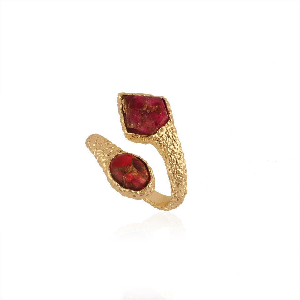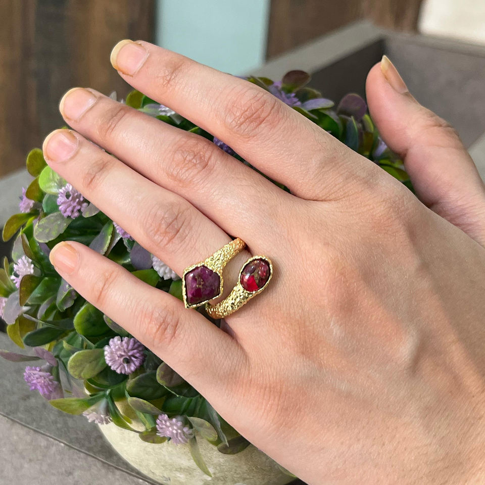 Bague Serpent Ouverte en Laiton Plaqué Or 18 carats avec Double Pierre Précieuse Rubis Mohave et Turquoise Cuivrée, Réglable, Style Moderne, Pierres Synthétiques