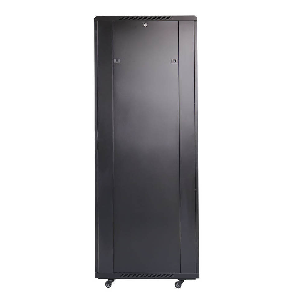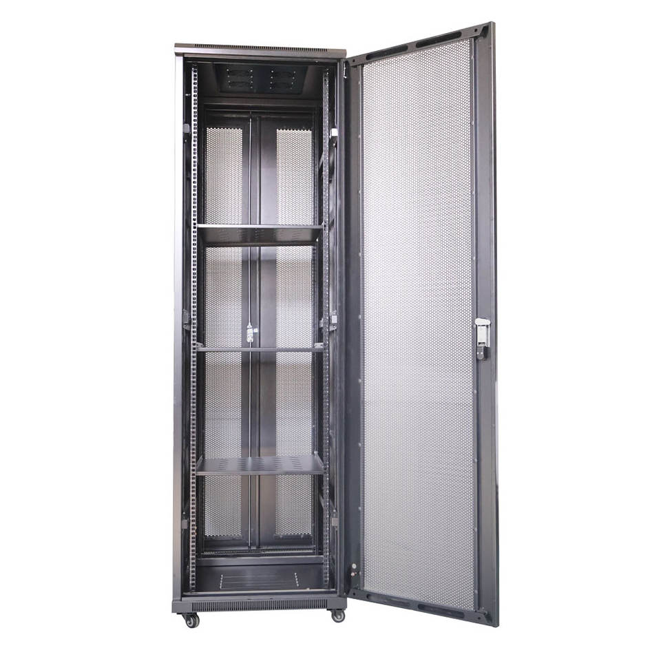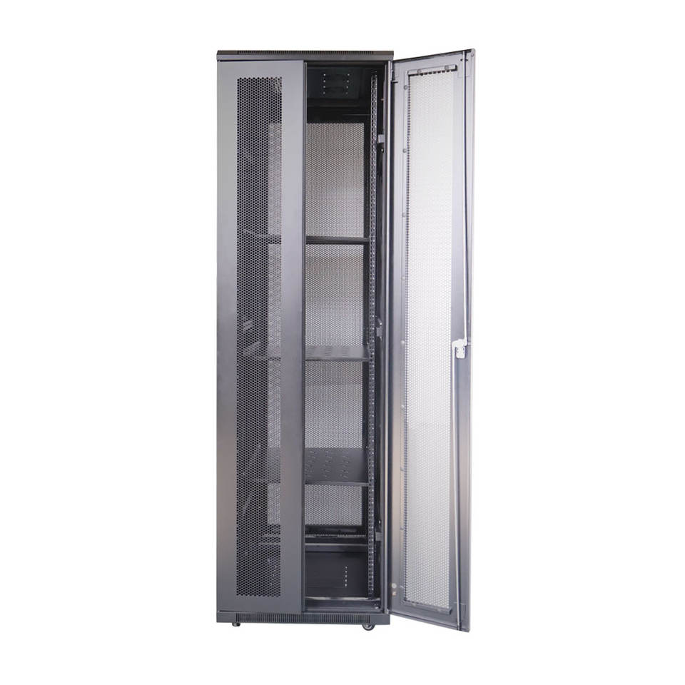 Armoire serveur 19 pouces standard avec porte avant ventilée en arc et serrure à ressort, et porte arrière ventilée à double ouverture