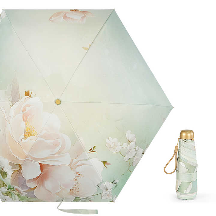 Parapluie pliant 5 sections personnalisé en pongé, imperméable, pour voyage, soleil et pluie.