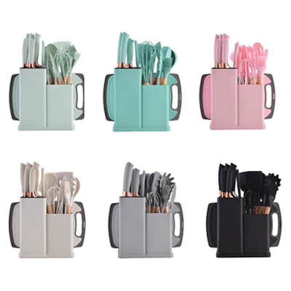 Ensemble d'ustensiles de cuisine 19 pièces en silicone avec planche à découper, support de rangement et couteau à manche en bois