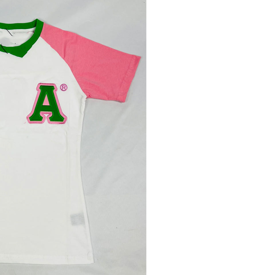 T-shirt ALPHA KAPA ALPHA 1908, style grec, avec logo brodé en chenille personnalisé, blanc, vert et rose